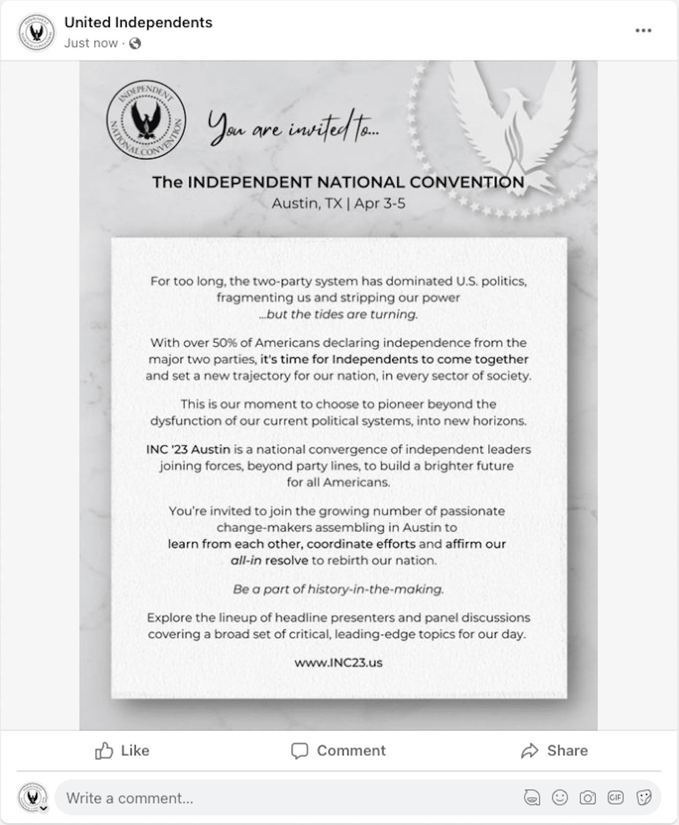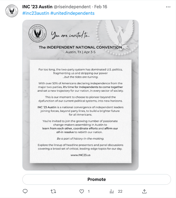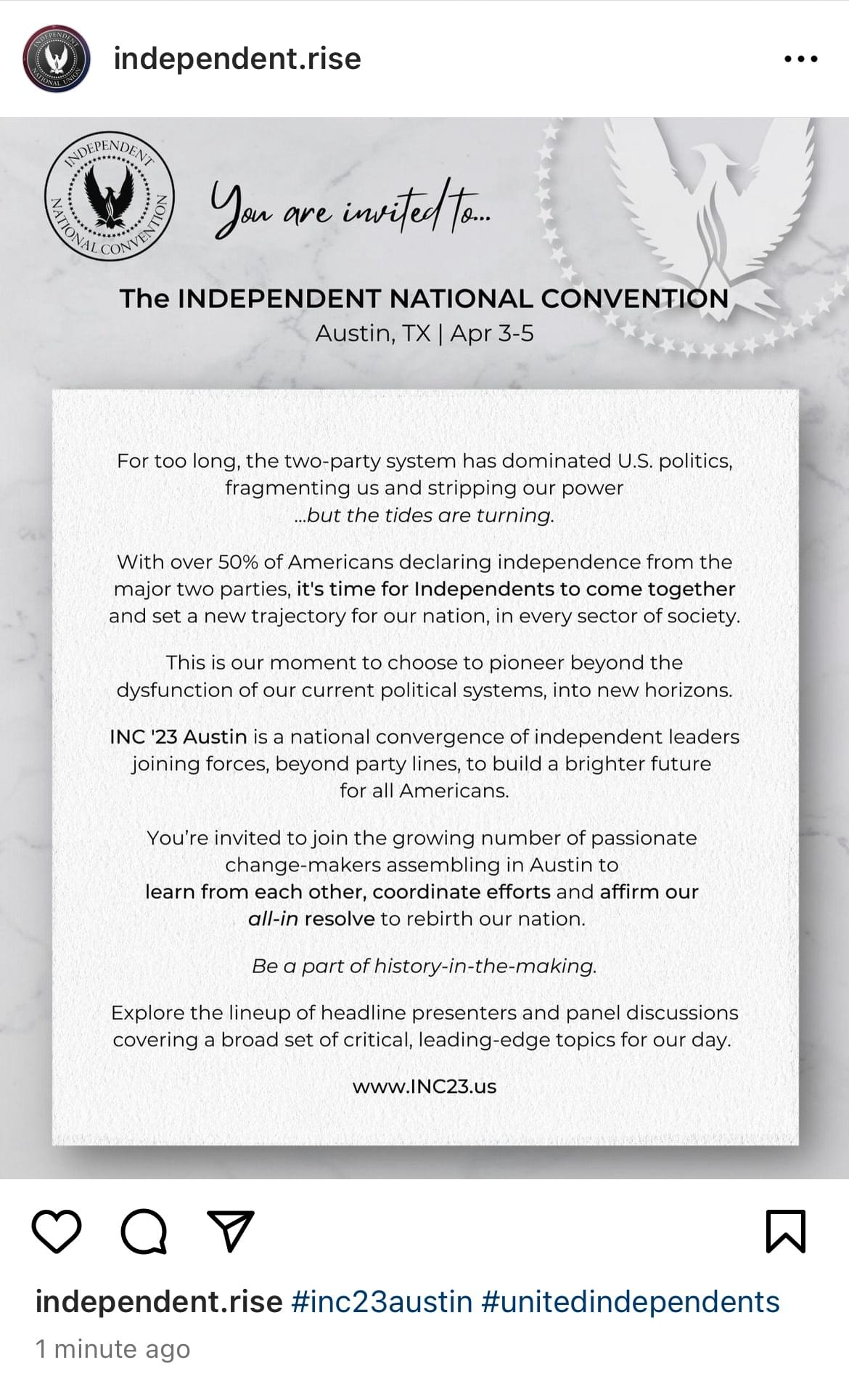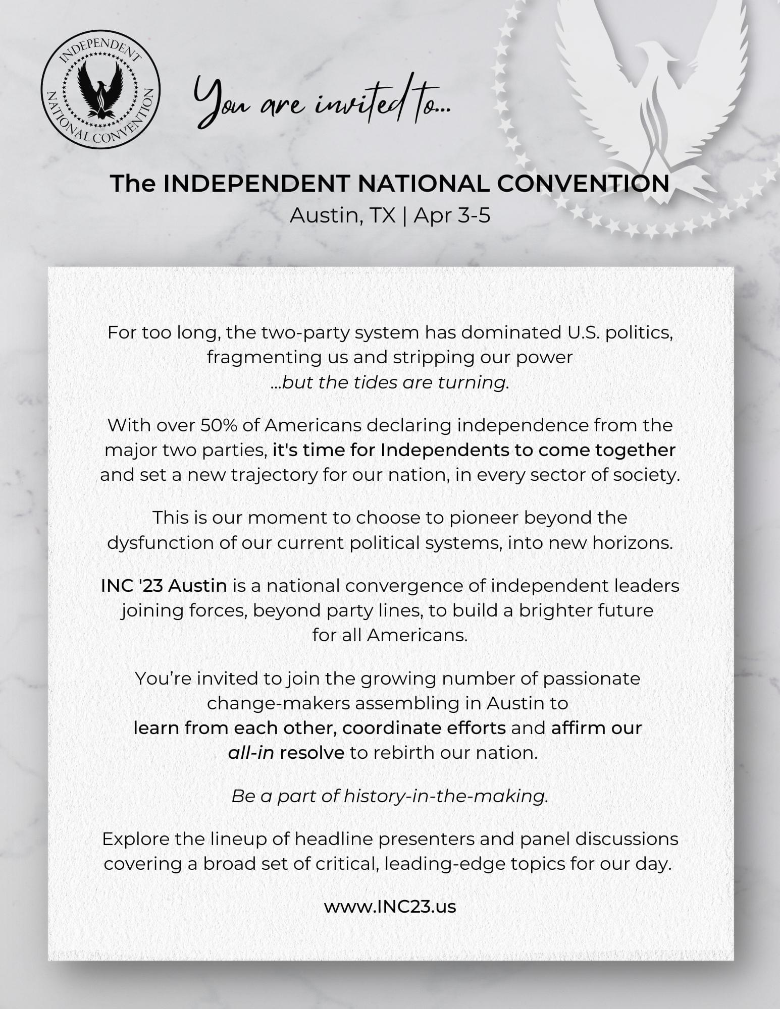 Thank you for your support in helping to promote this upcoming national Independent leadership convergence.